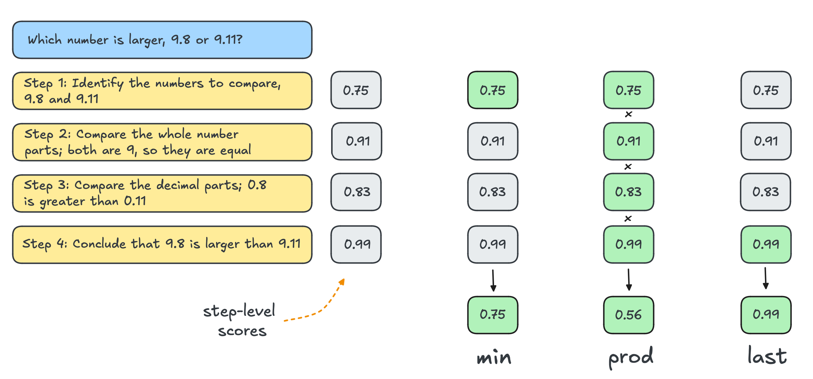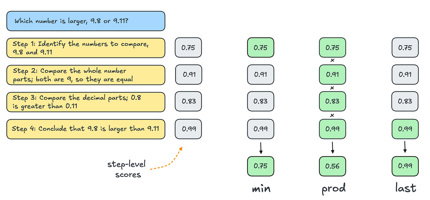 PRMs can be used as a verifier for scaling test-time reasoning. In this example, a PRM evaluates the correctness of each reasoning step. We can consider reducing the step-wise scores to a single score by using the minimum score (left), the product of all scores (middle), or the score for the final step (right). Source: Scaling test-time compute, Beeching et. al, 2024