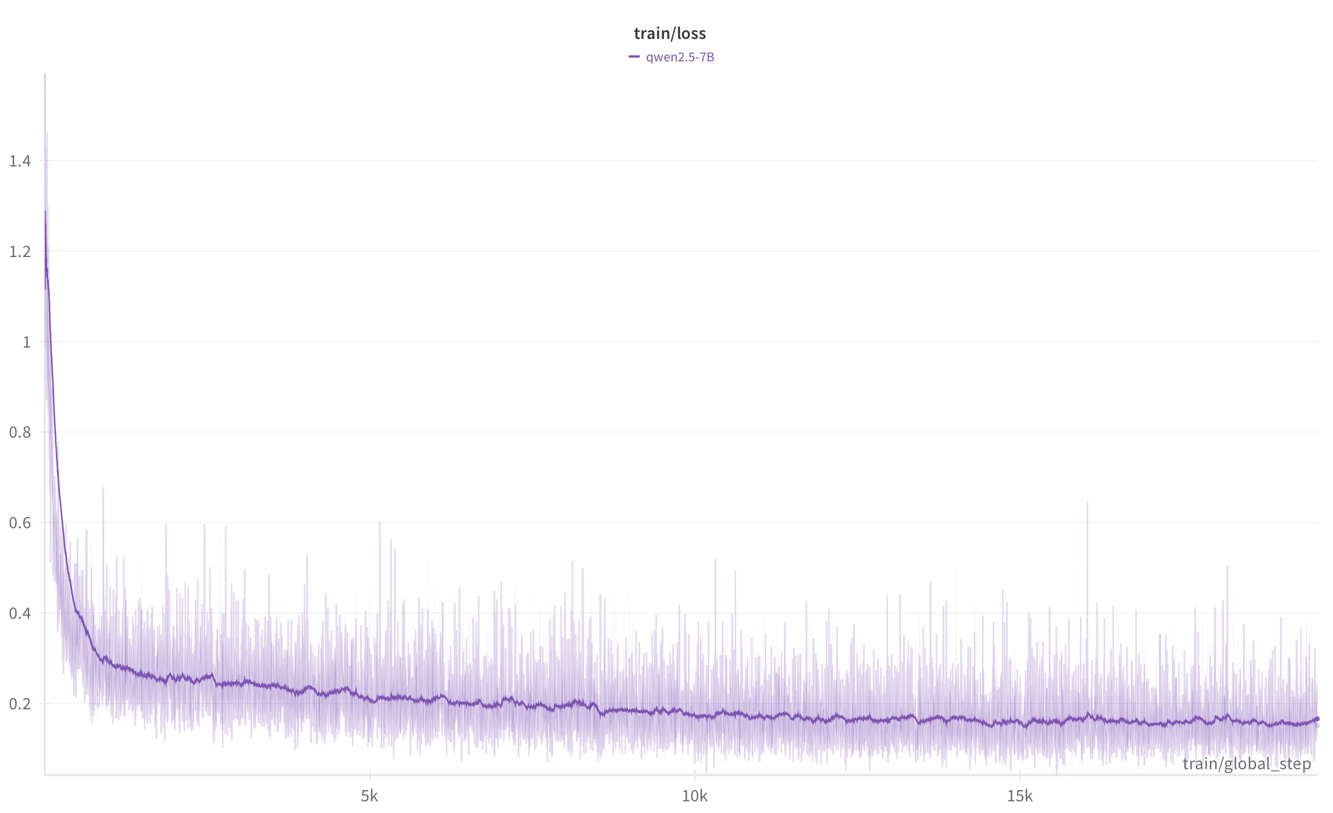 Our model was trained on 6 A100 80GB GPUs for a single epoch, with a maximum sequence length of 4096, and taking ~80 hours to complete. As above, we simply executed axolotl train prm.yaml to kick off training with our config file! If you’re following along and using Weights and Biases, you should see a training curve like this: